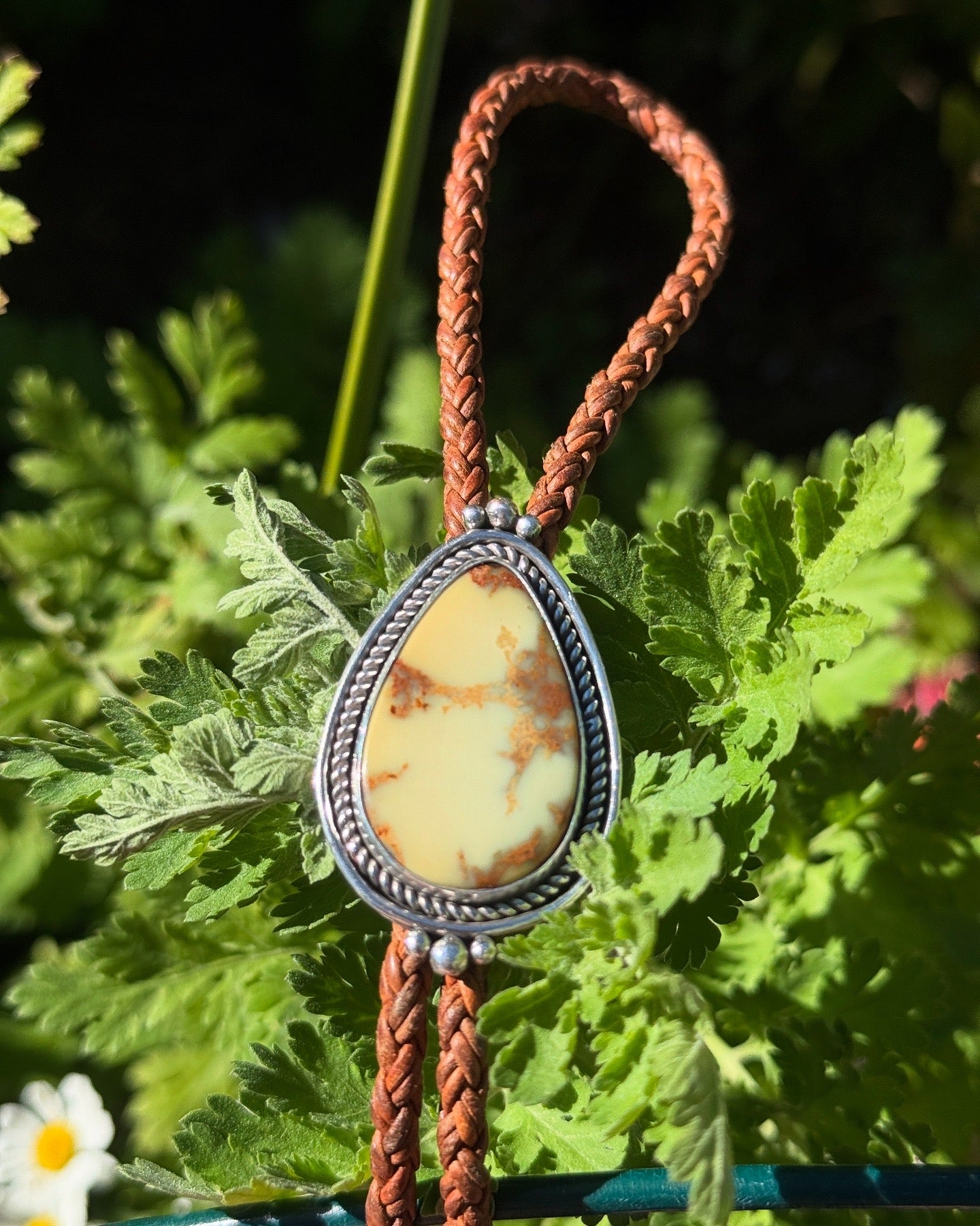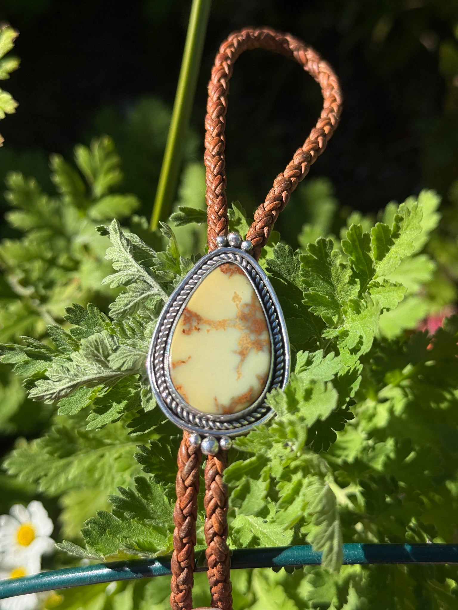 This bolo tie features a gorgeous piece of Aloe variscite with an autumnal color scheme that is very butterscotch-coded. I wrapped this stone in a layer of twist wire, smooth wire, and finished off with handmade sterling silver accent balls.