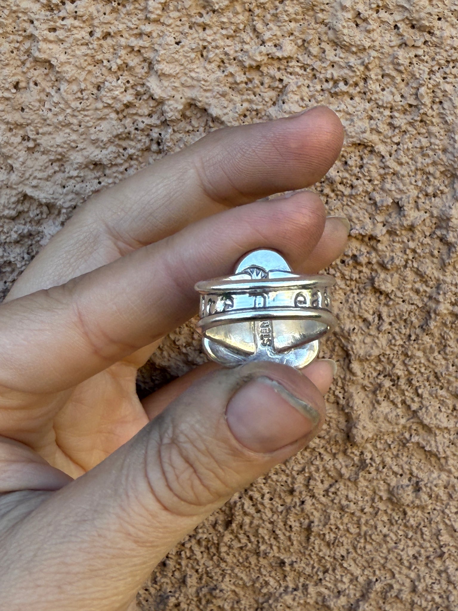 Handmade by me, Stephanie Stamp, under the sunny skies of New Mexico. Turquoise is considered a relatively soft and porous stone, and as with all silver based jewelry, this gem should be taken off when showering, applying lotion, etc. to avoid discoloration of the stone and to keep this piece in beautiful condition for years to come!