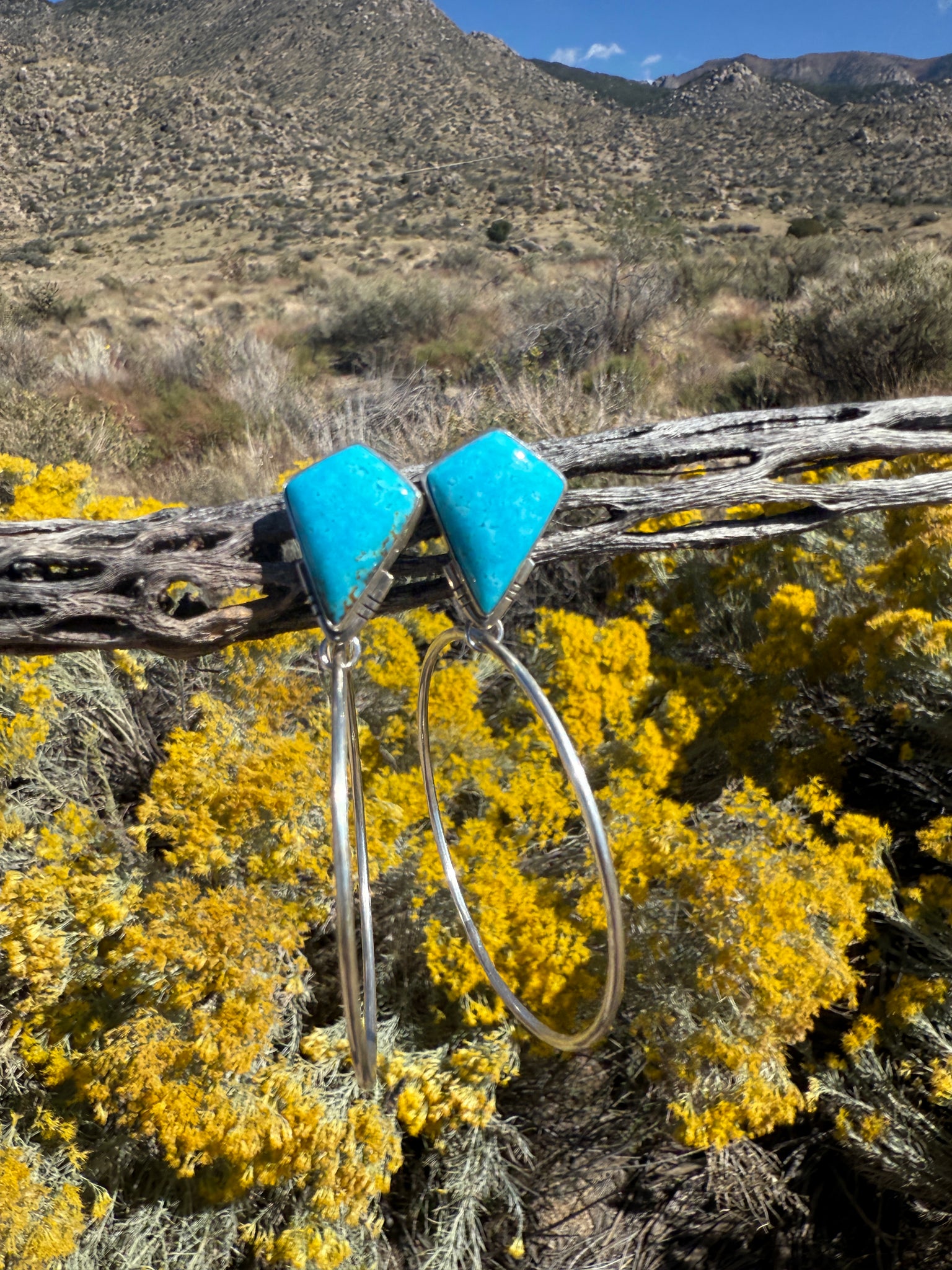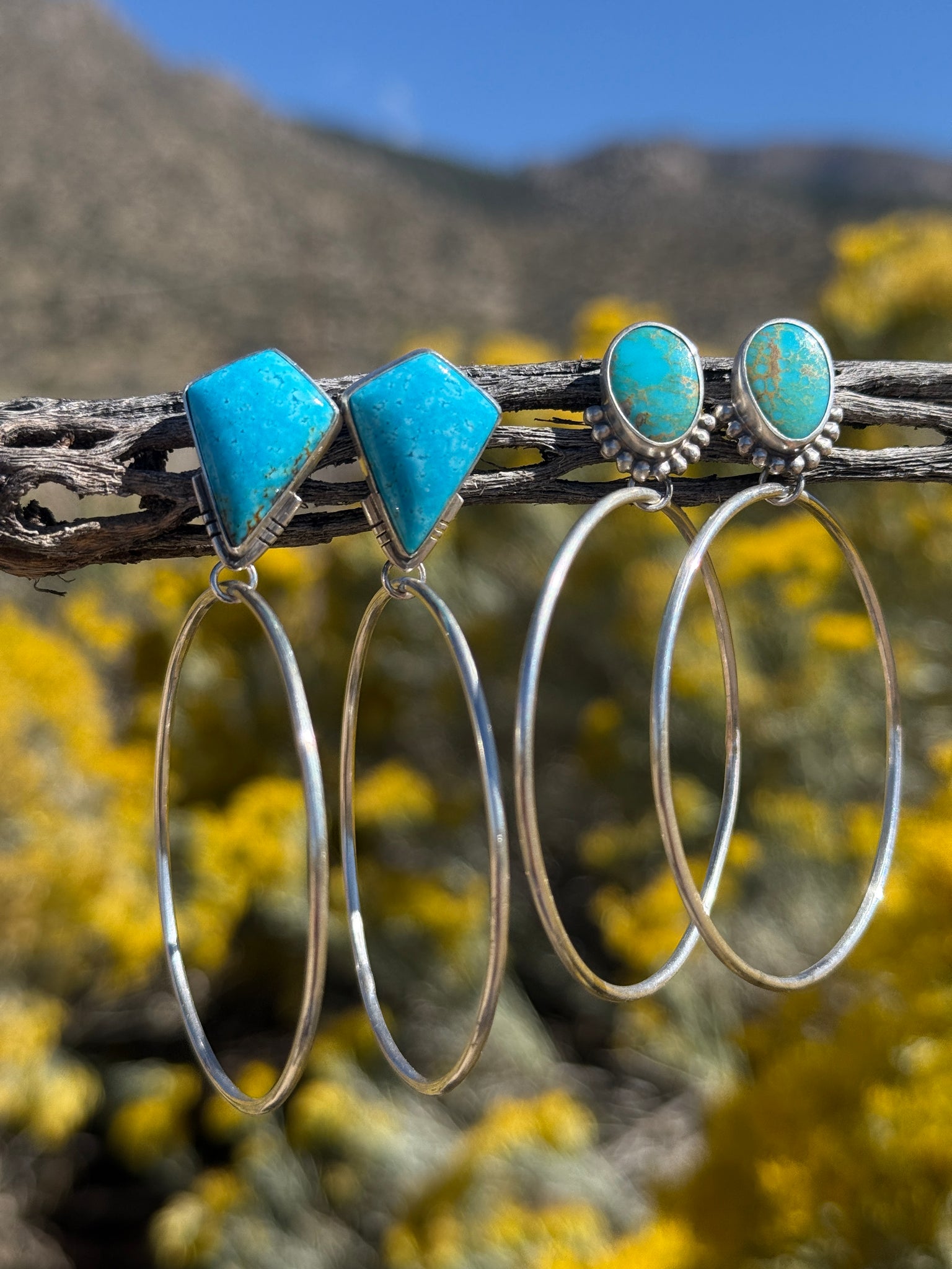 This pair of post hoops features some bright blue turquoise cute into a fun shape - kites! Both stones are framed with a half wire border with decorative notches cut into them.