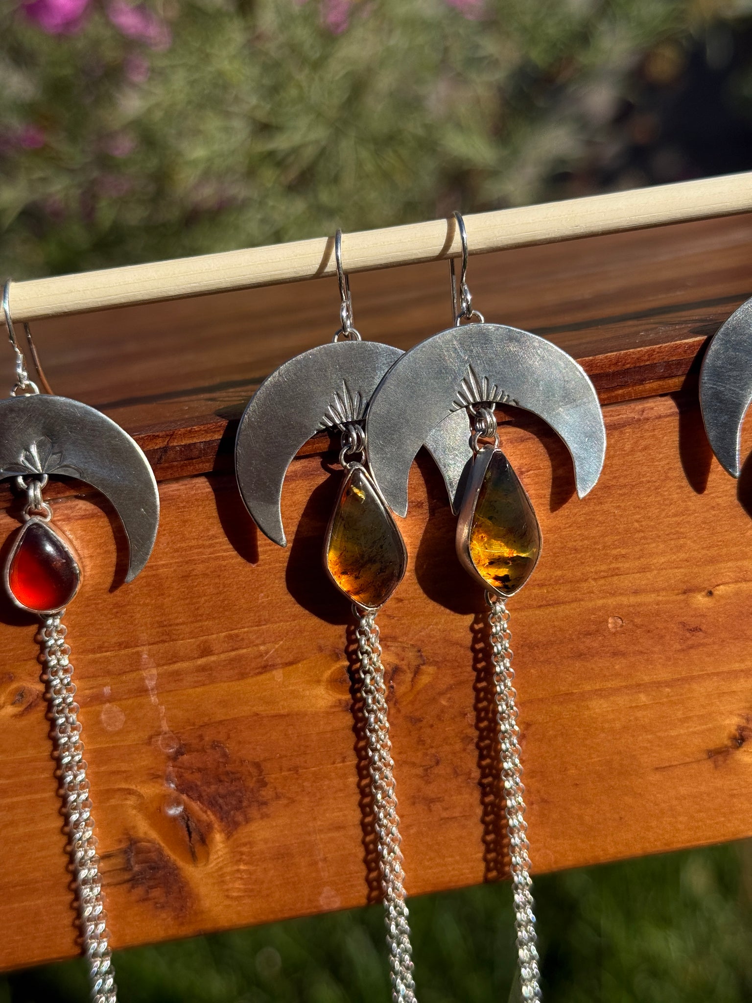 This pair features Mexican amber with some lovely inclusions swirled through, with chains that measure 3" which is perfect to just barely dust your shoulders.