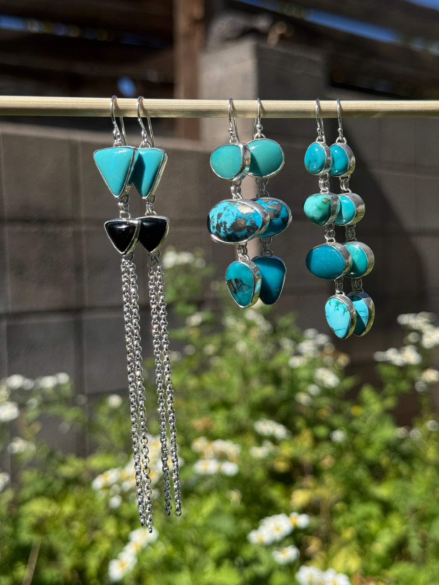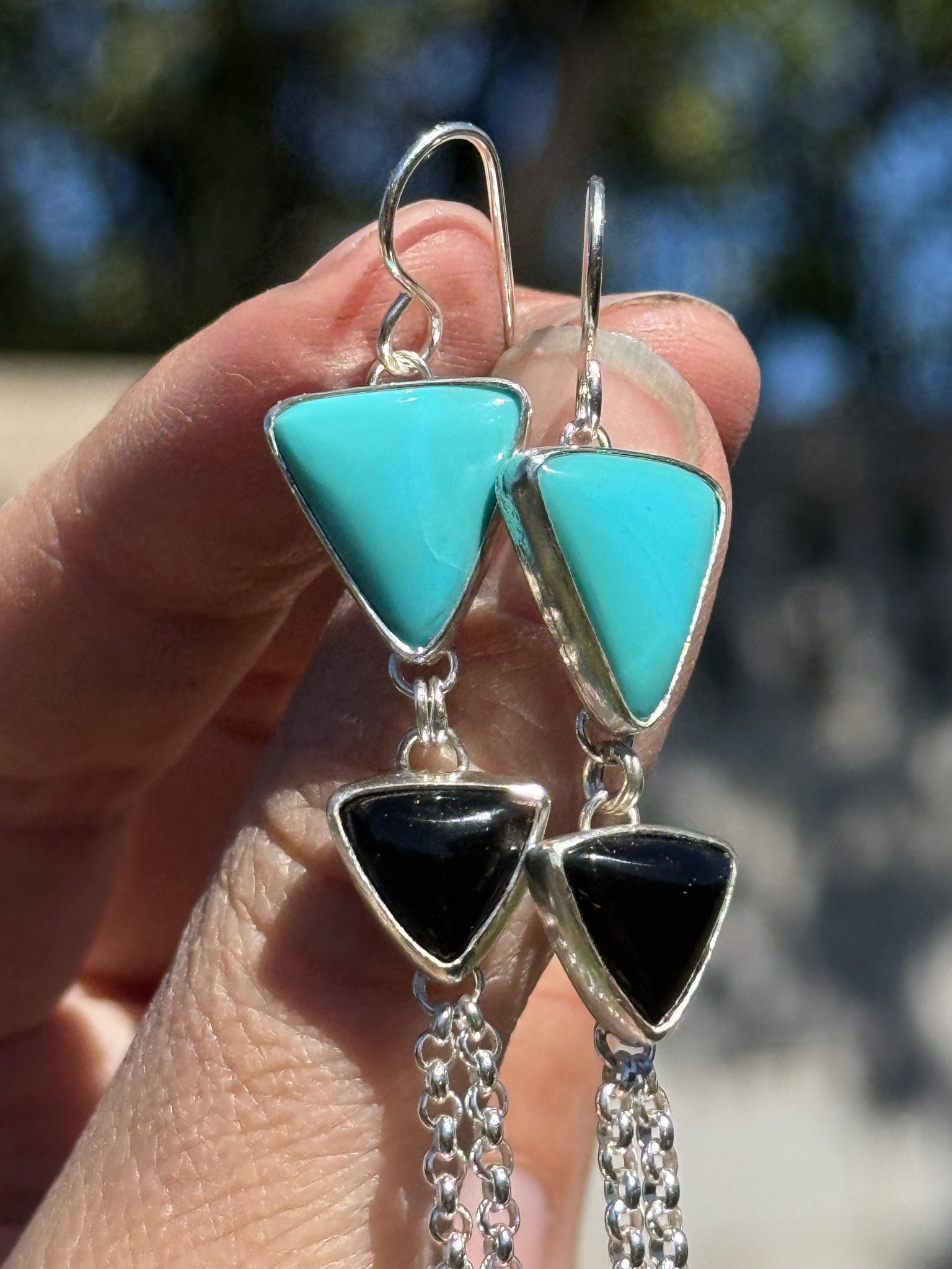 Turquoise and black onyx were meant to be together! These earrings feature some clear blue turquoise and onyx triangles, with 3" of rolo chain for movement below and sterling silver hook ear wires.